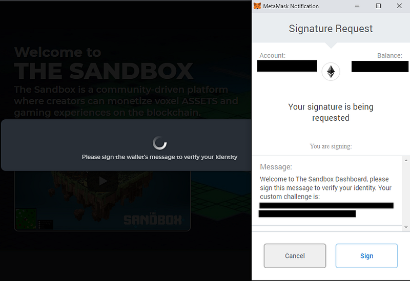 You should get a prompt from the MetaMask browser extension asking you to sign a signature request that will allow MetaMask to log you into The Sandbox. Click the Sign button on this prompt.